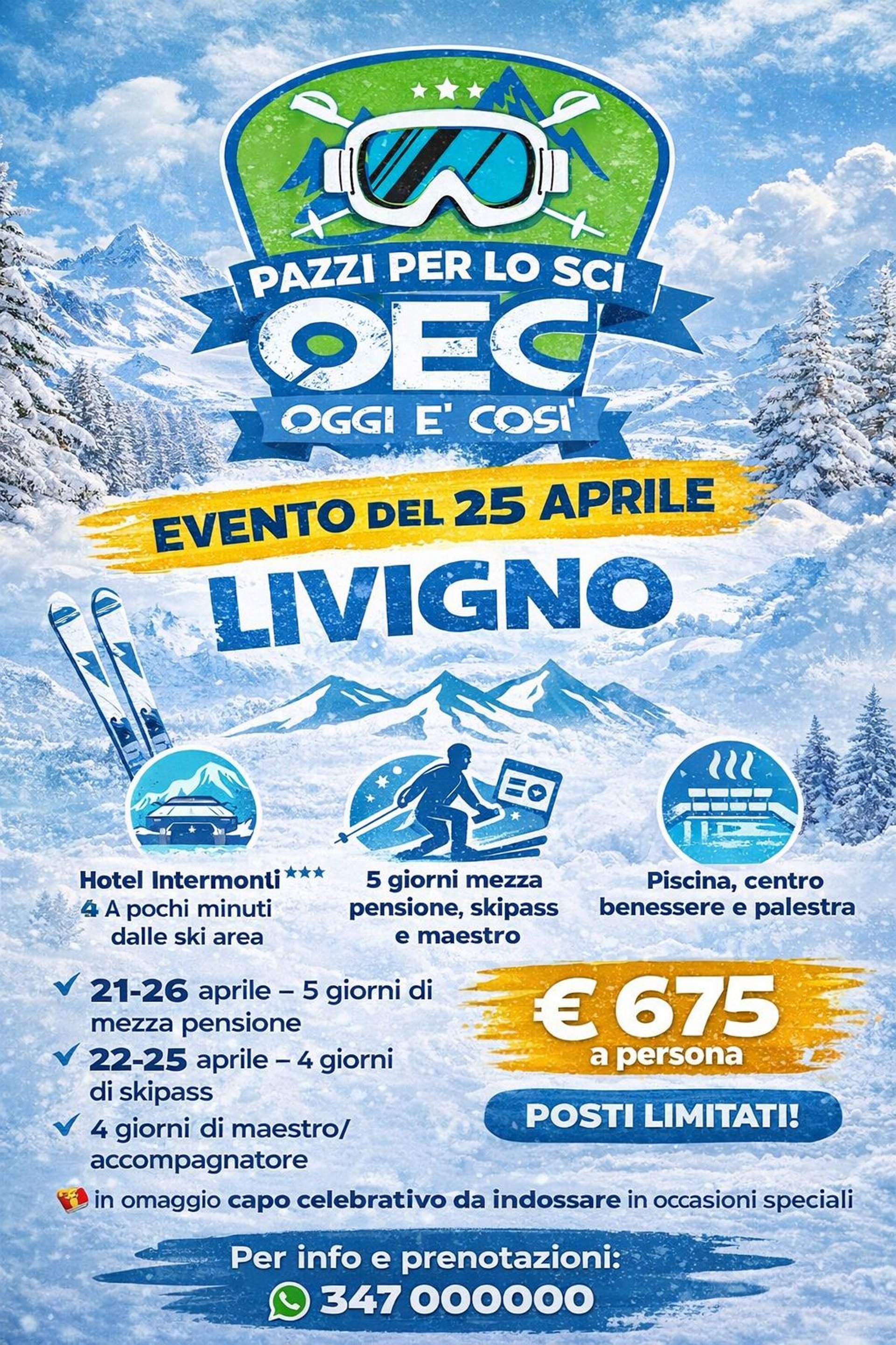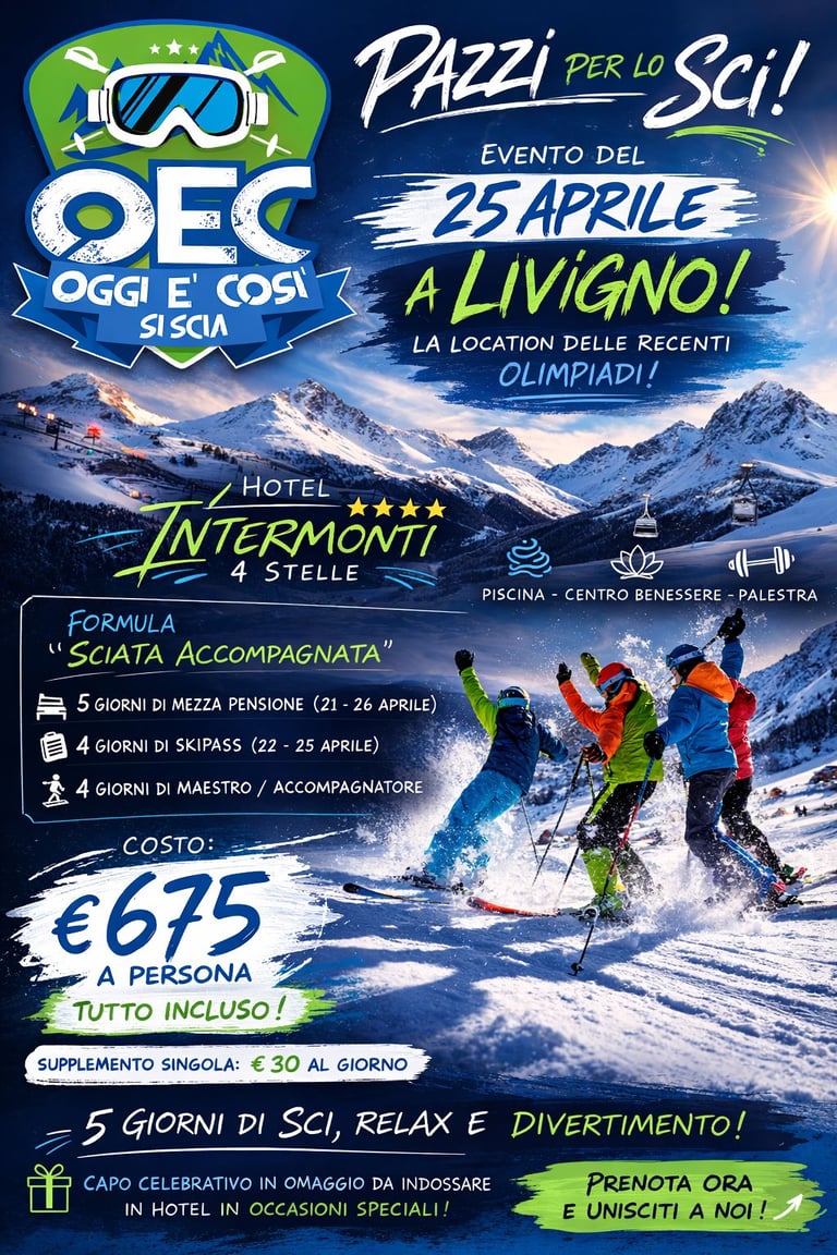 Oec pazzi per lo sci come ogni anno organizza l evento del 25 aprile scegliendo una location Livigno che è stata quella delle recenti Olimpiadi . L hotel che ci ospiterà sarà l ‘ Intermonti a pochi minuti dalla ski area Mottolino e dal Carosello 3000 !!!! La formula prevista è la sciata accompagnata che prevede quanto segue :